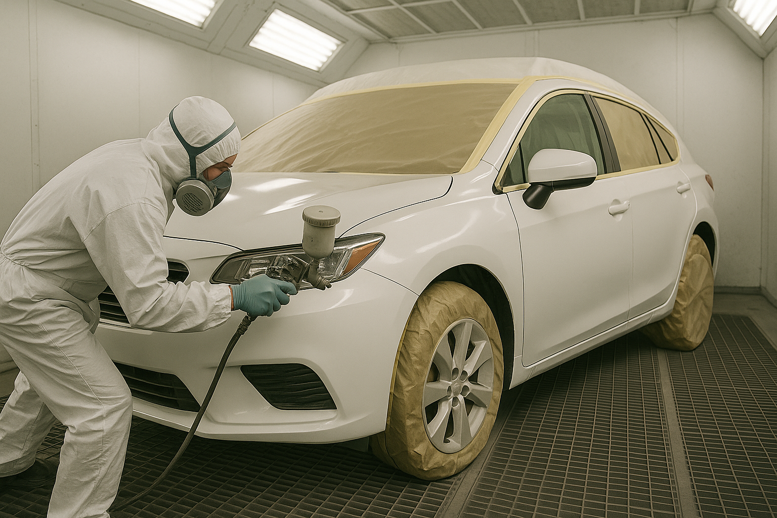 In a controlled environment, we apply primer, basecoat, and clearcoat in precise layers—curing between steps for long-term durability and gloss.